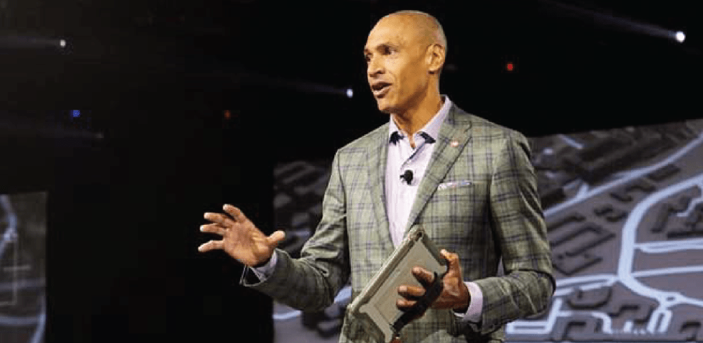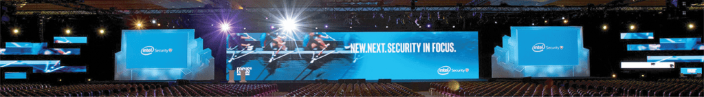 A cartography-themed event has the CEO migrate across a stage inspired by ‘shards’ from the McAfee brandmark. Numerous parallelograms combine to create a logo-inspired ‘mainland’, a jutting ‘peninsula’, and an ‘island’ amidst the audience (where speakers advance both graphics and downstage notes using an iPad, shown above) before returning ‘home’ to the mainland for a powerful close.