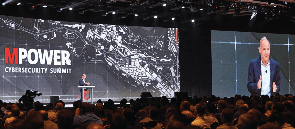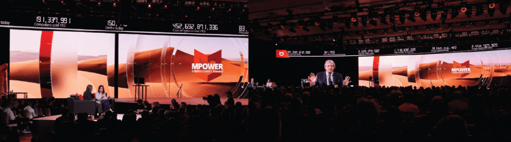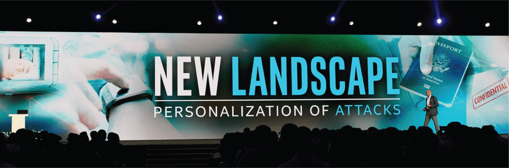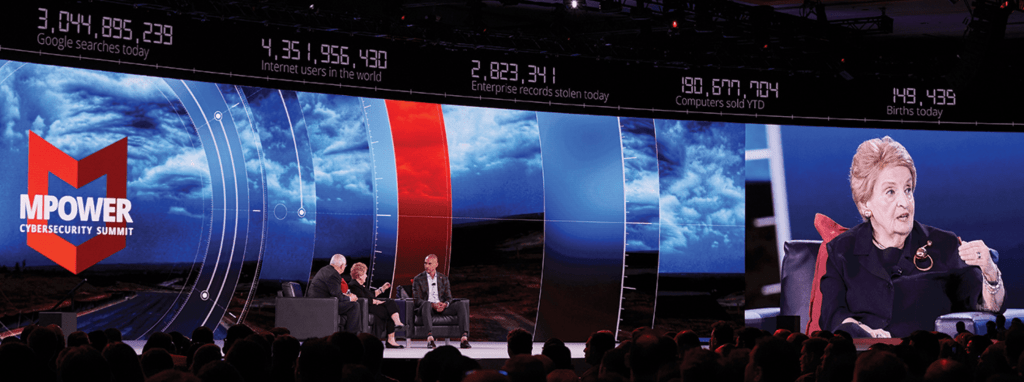 Given the outsize role of ‘time’ in cybersecurity, main stage keynotes feature clock and watch face-shaped stages, images of temporal phenomena in the natural world, and a winding chyron ribbon above the proscenium with 24 timers scrolling two dozen aspects of the digital world. Activated by the CEO on Day One, the numbers track the story of the growing attack surface across the week-long event.