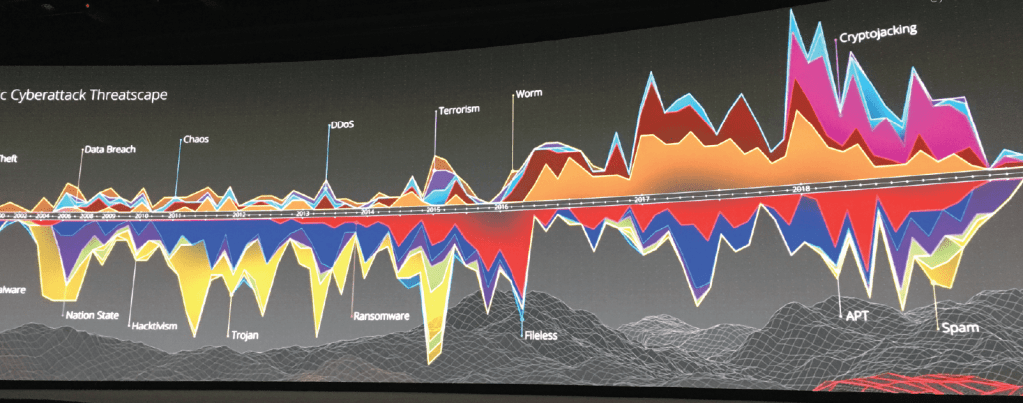 Presenters have the ability to zoom in by type, severity, and frequency. Updated monthly, data behind the image powers a signature set piece in CEO keynotes across several years. The graphic also features in large-scale architectural installations in company and partners offices around the world.