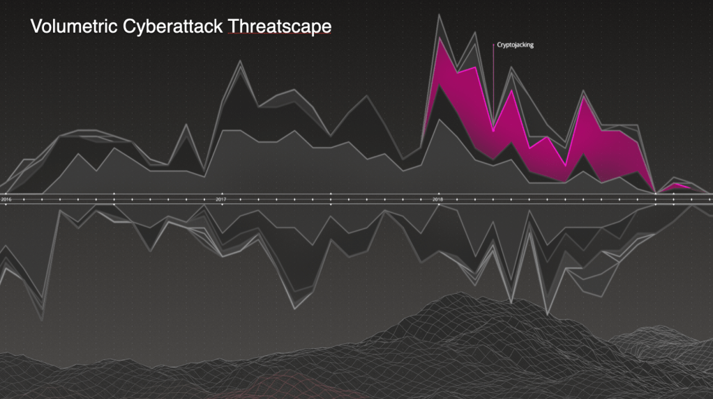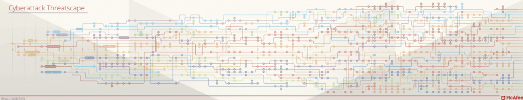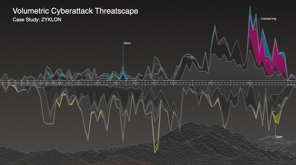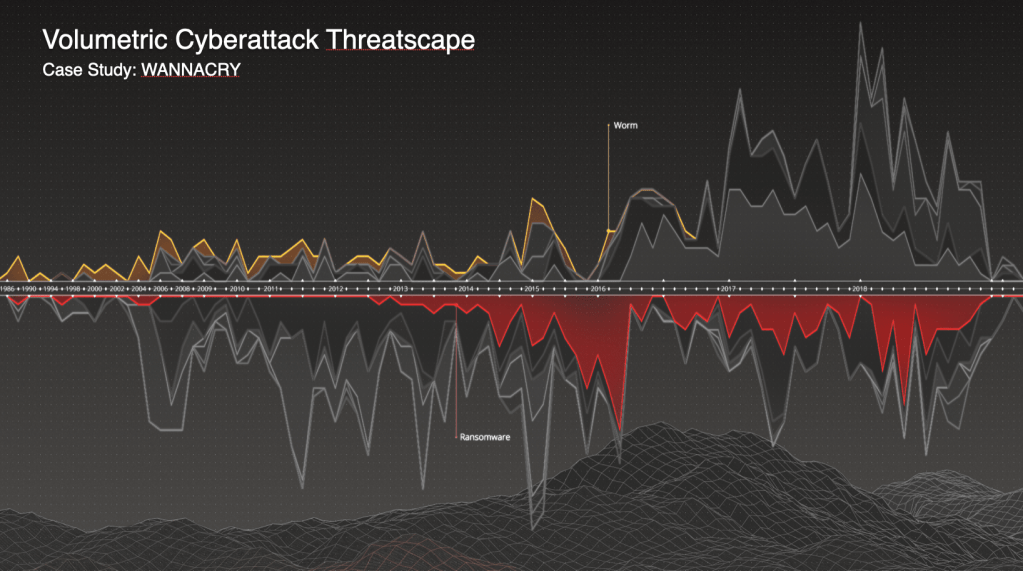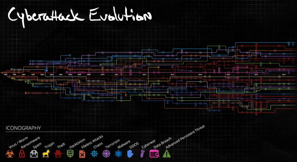 Six views of a dynamic, animated illustration of more than 1,200 cyberattacks organized by category and presented across three decades.