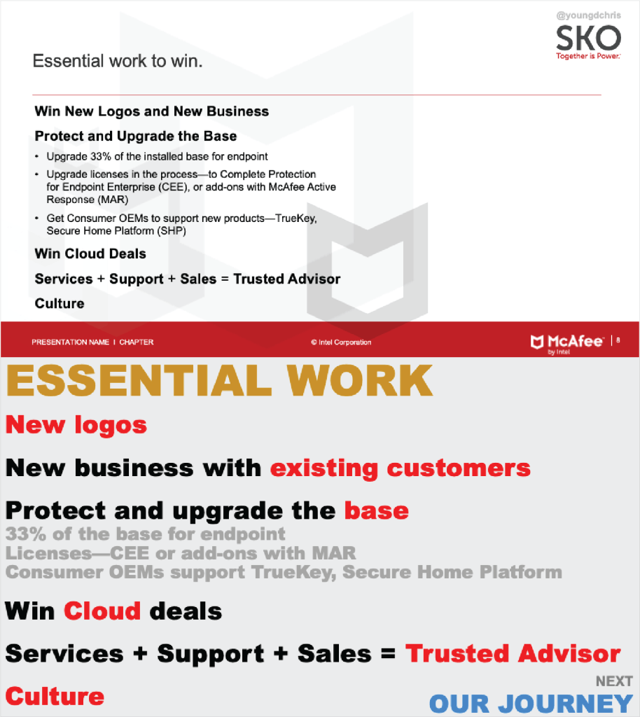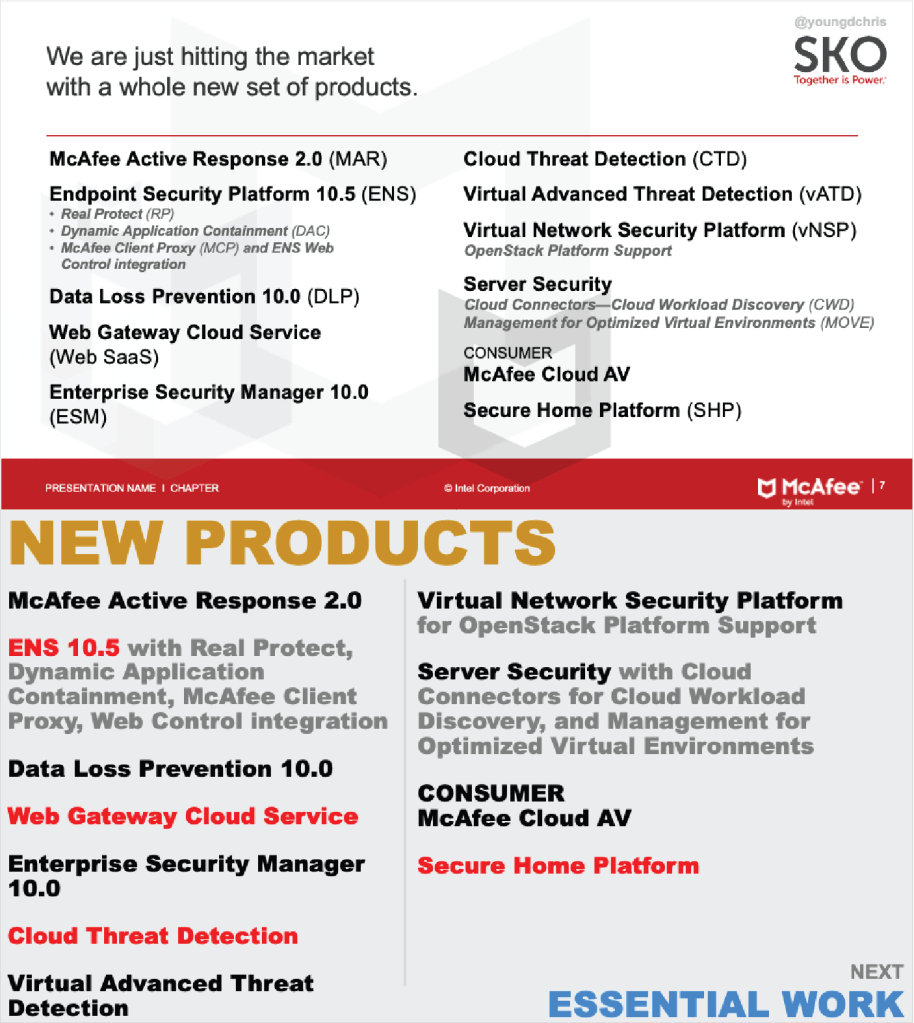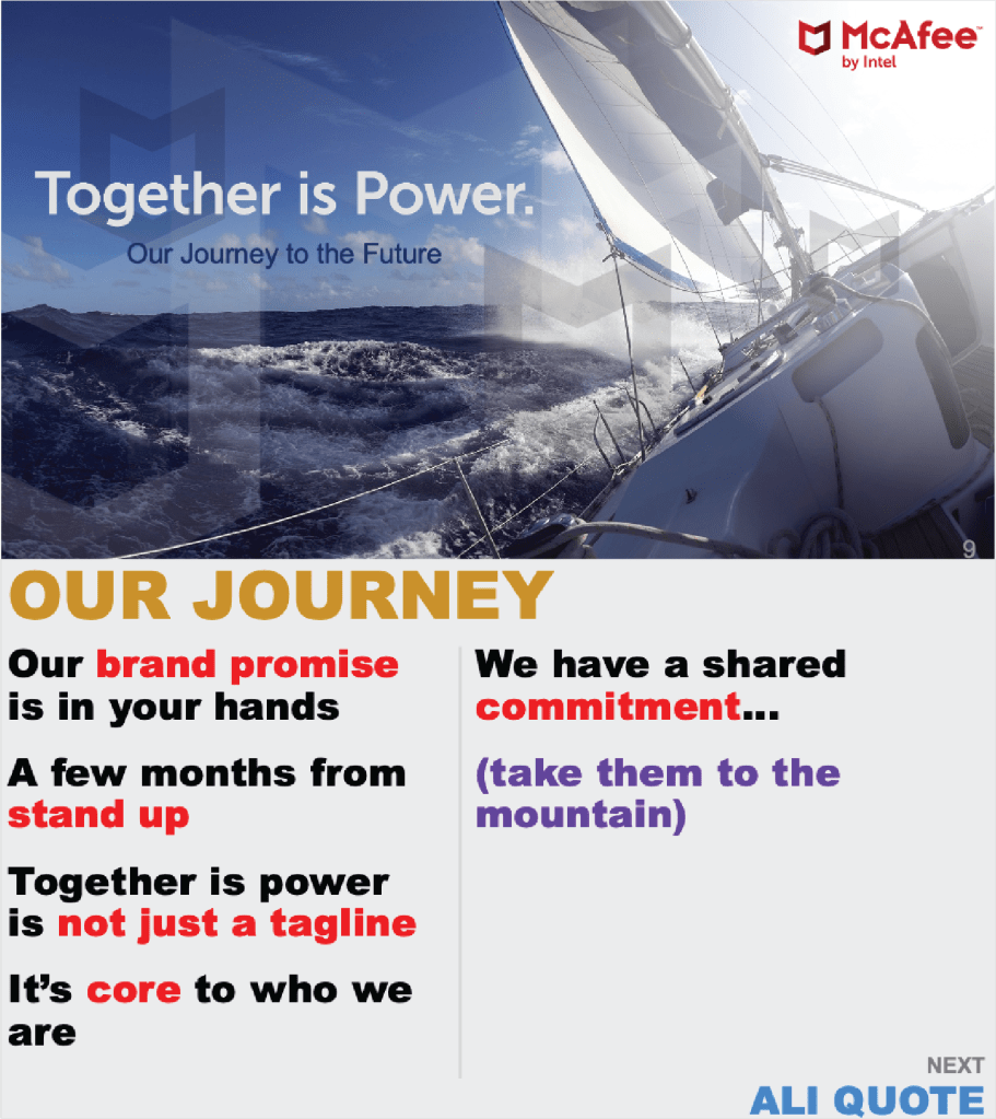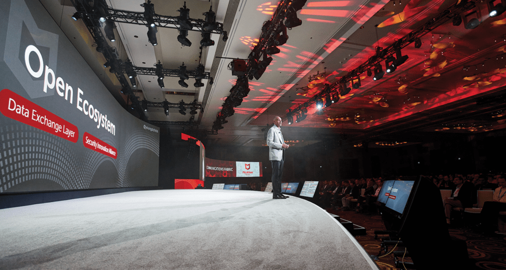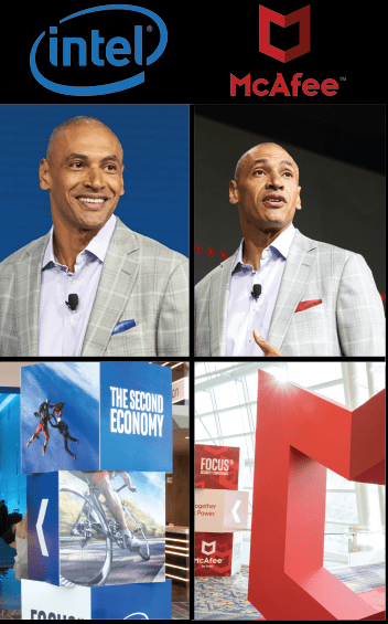 Seven minutes into his Day One keynote, the CEO announces the spin out and standup of a new company. In that moment the entire conference changes livery from Intel blue to McAfee red.
