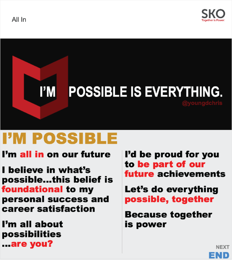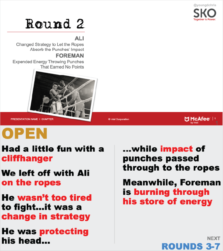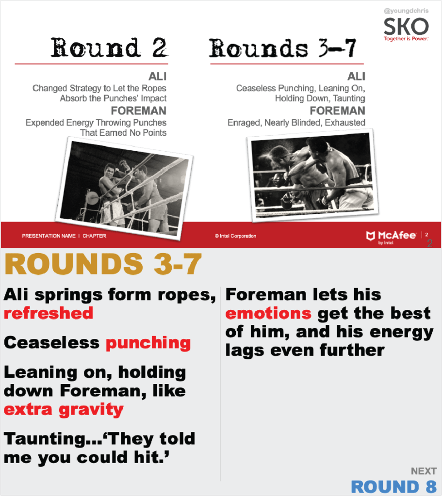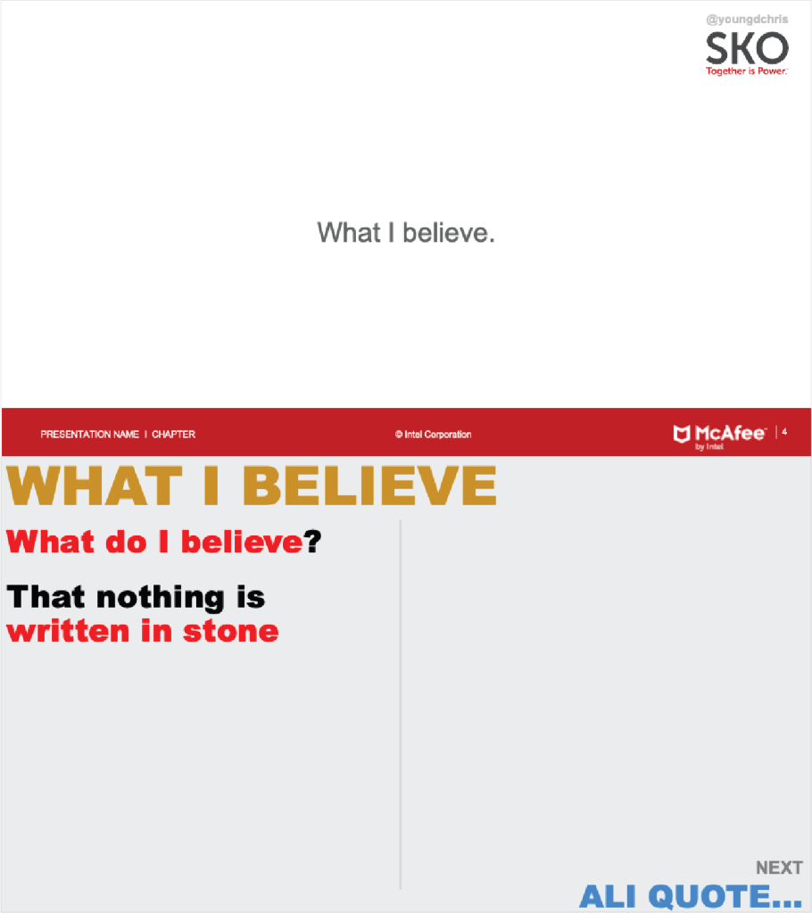 Seven minutes into his Day One keynote, the CEO announces the spin out and standup of a new company. In that moment the entire conference changes livery from Intel blue to McAfee red.