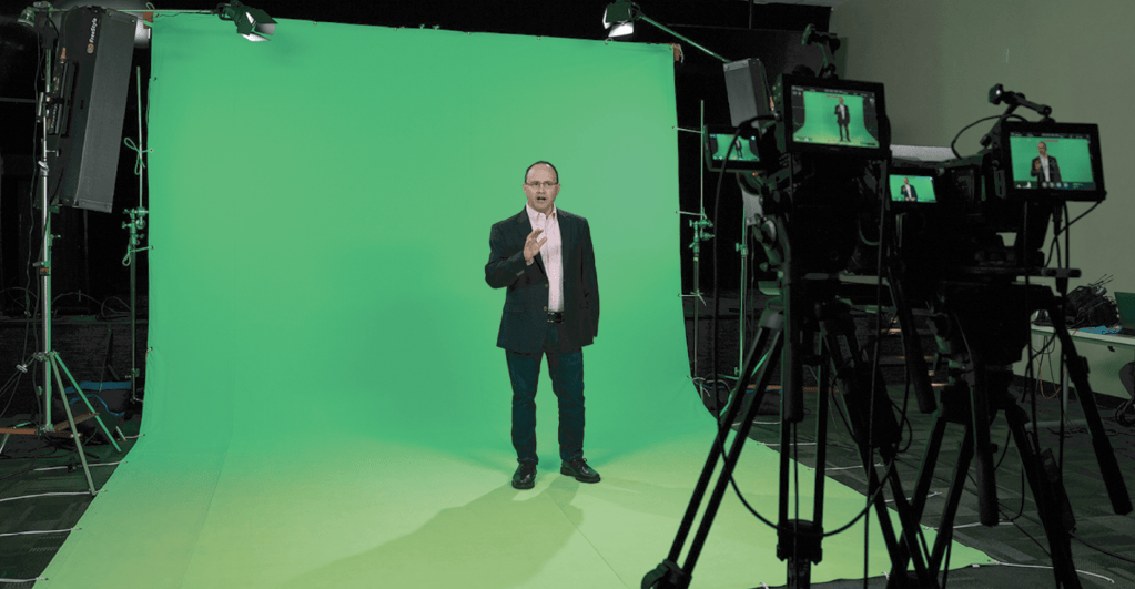 A green screen production crew visits two cities to tape three executives in a sterile and socially-distanced studio environment.