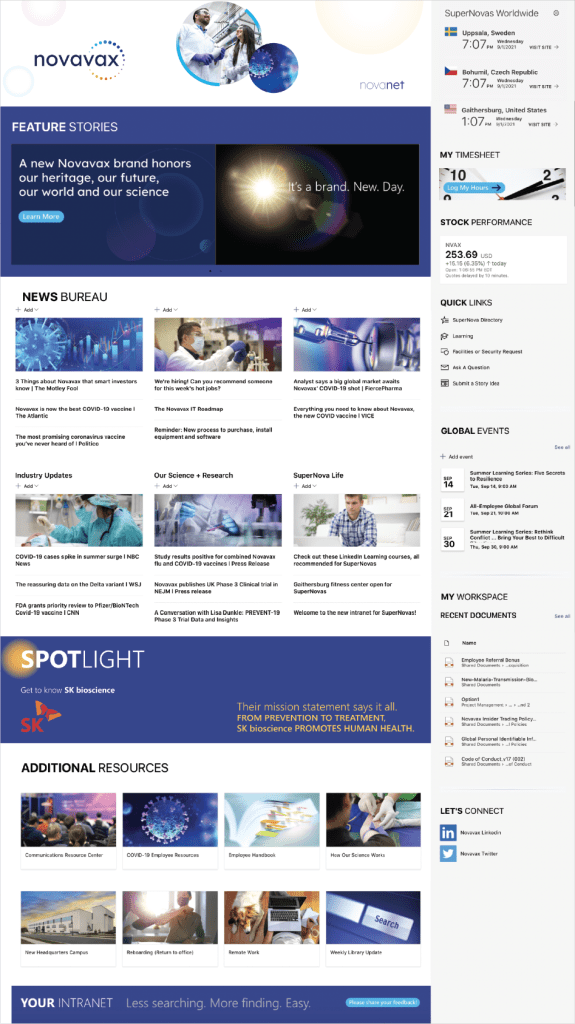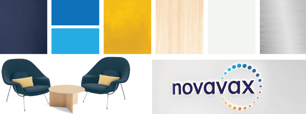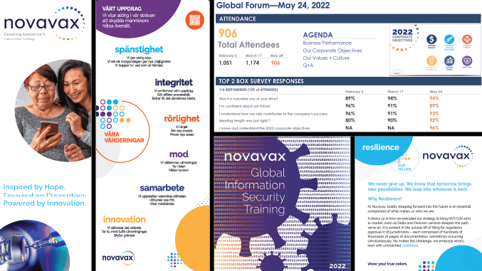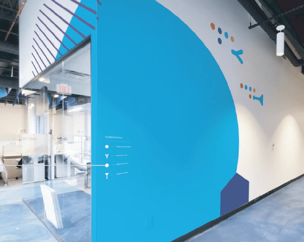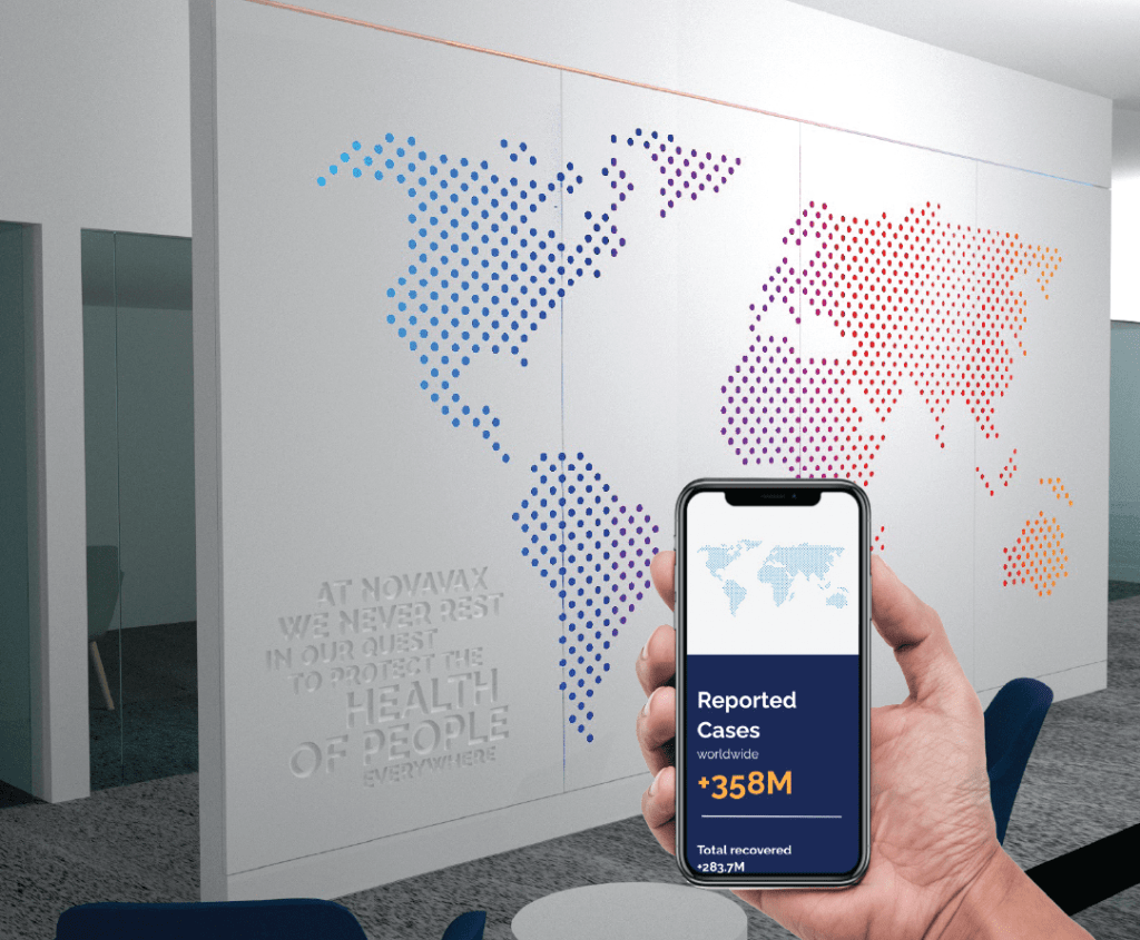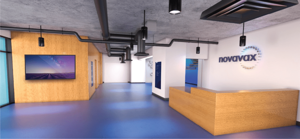 Custom wallpaper features shapes unique to the company’s vaccine nanoparticle technology. An embedded ‘legend’ at ‘neighborhood intersections’ (shown below) defines the meaning behind each shape, from nanoparticle and T-Cell Receptors, to a proprietary Matrix-M Adjuvant, more.