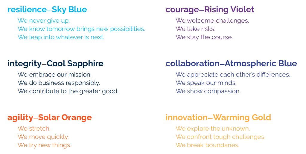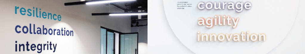 A ‘Values Walk’ anchors the HQ experience (each value treatment matches the color palette of the neighborhood it is adjacent to). Other options include interactive light installations and vinyl or painted, but still high-impact designs. Values videos, featuring employees and partners, stream via a global Content Management System (CMS).