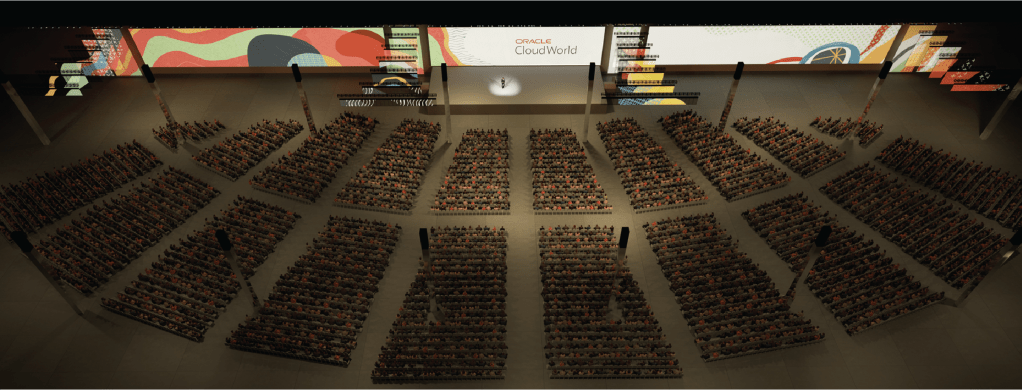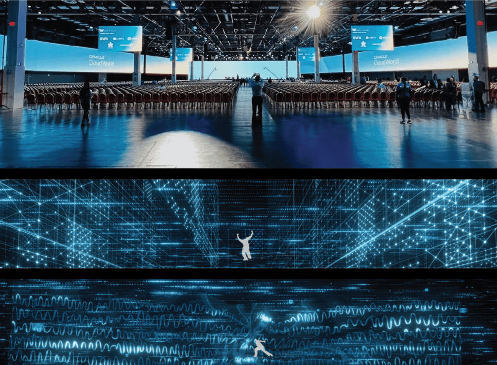 Oracle’s DNA – its technology – is on full display from the starting line in our opening moment. Animations comprised of 100s of millions of pixels glow and recombine in an endless cavalcade of light and shadow. The gesture, the cloud, the faces and motions of real people…all are brought to vivid, undeniable life through the wizardry of the industry’s keenest animators and digital artists. What’s more, our performer – a proxy for the 10s of 1000s of Oracle practitioners at CloudWorld – is both seemingly immersed by the screenscape surrounding them, but also responds to and directly affects onscreen movements through interactions that are both concrete and lyrical. More than 700′ of linear screen surface are enlivened by our central canvas which is the primary focus, but as with any immersive experience, the animations and subtle movements that surround our audience on the periphery exponentially build on the impact of our mainstage performance.