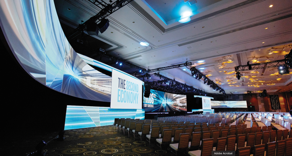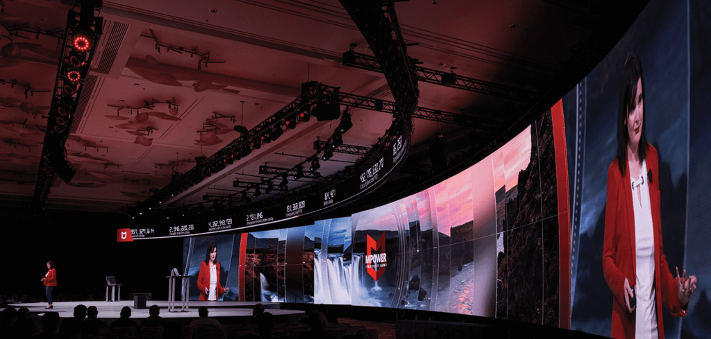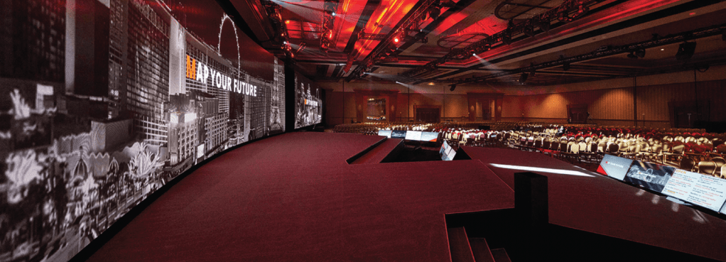 Multiple innovations set this event apart. First, a zig-zag stage in the center of a sprawling ballroom with two overhead and mirrored widescreen displays, each one facing one half of the audience.