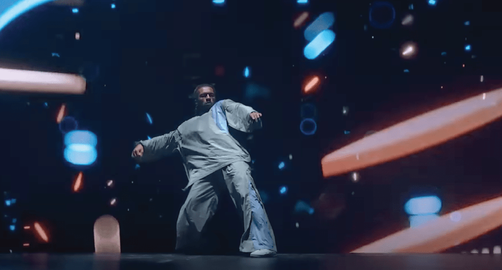 The excitement of walk-in is heightened by a curated track of music that grows in volume until its obvious the moment has arrived. Smoke and fanning arcs of light from rigging overhead match the sense of an anticipation. Finally, the music cuts, the lights settle and didm, and the opening bars of our composition fill the air. In darkness, our ‘THX-inspired’, technology-centric sound signature grows in volume until it reaches at the peak of the crescendo our performer is revealed in a hot downspout. In that moment of suspense their movement begins even as our track shifts to its main theme of rhythmic, pulsing drumming and chords following a steady beat. Familiar instrumentation gives our performer a human canvas against which to move and interact with our screens, both informed by its animations, but also inspired to affect those same patters of light to follow the lead of our soundtrack and its deep intent.